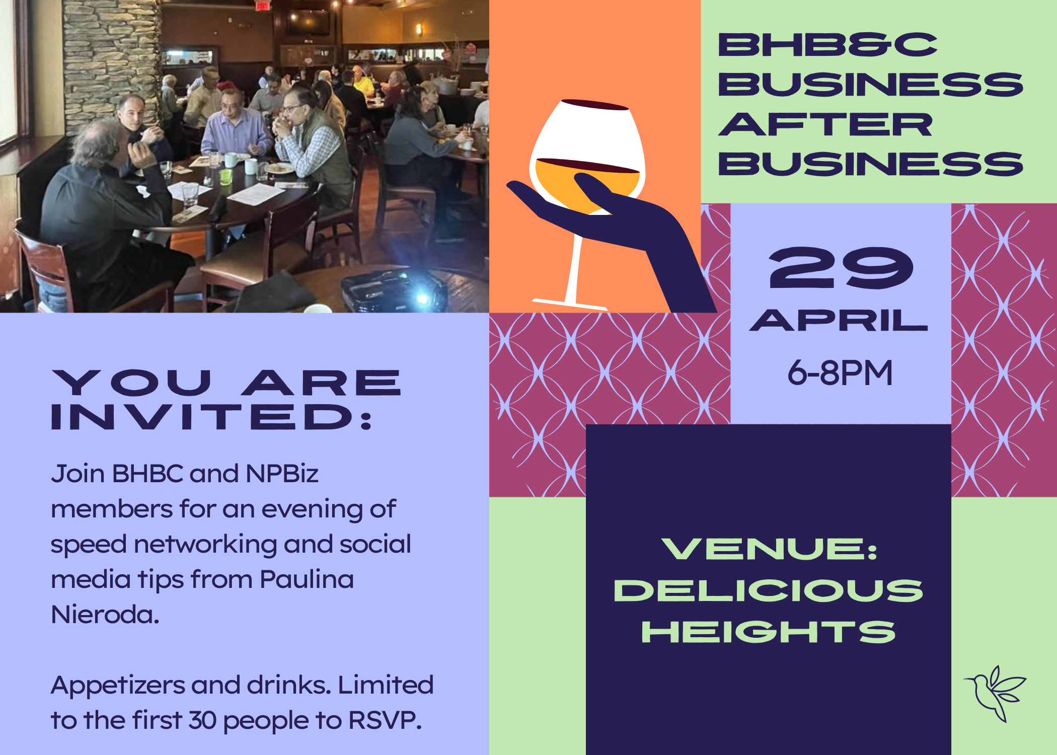 This April's meeting will be an after hours social on Wednesday April 29th from 6-8pm. This meeting is a joint networking event from BHBC and NPBiz. Speed networking; and social media tips from Paulina Nieroda, aka Nova Dama. Enjoy networking with appetizers and drinks; Limited to 30 guests. Guests are required to pay $5 via […]